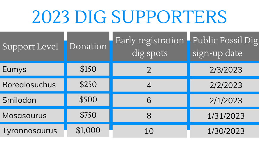Dig Supporters are the backbone of our fundraising efforts here at Friends of NDGS Paleo! Each year, we offer the opportunity for you to donate at different levels to help support NDGS Paleontology and the Public Fossil Digs.